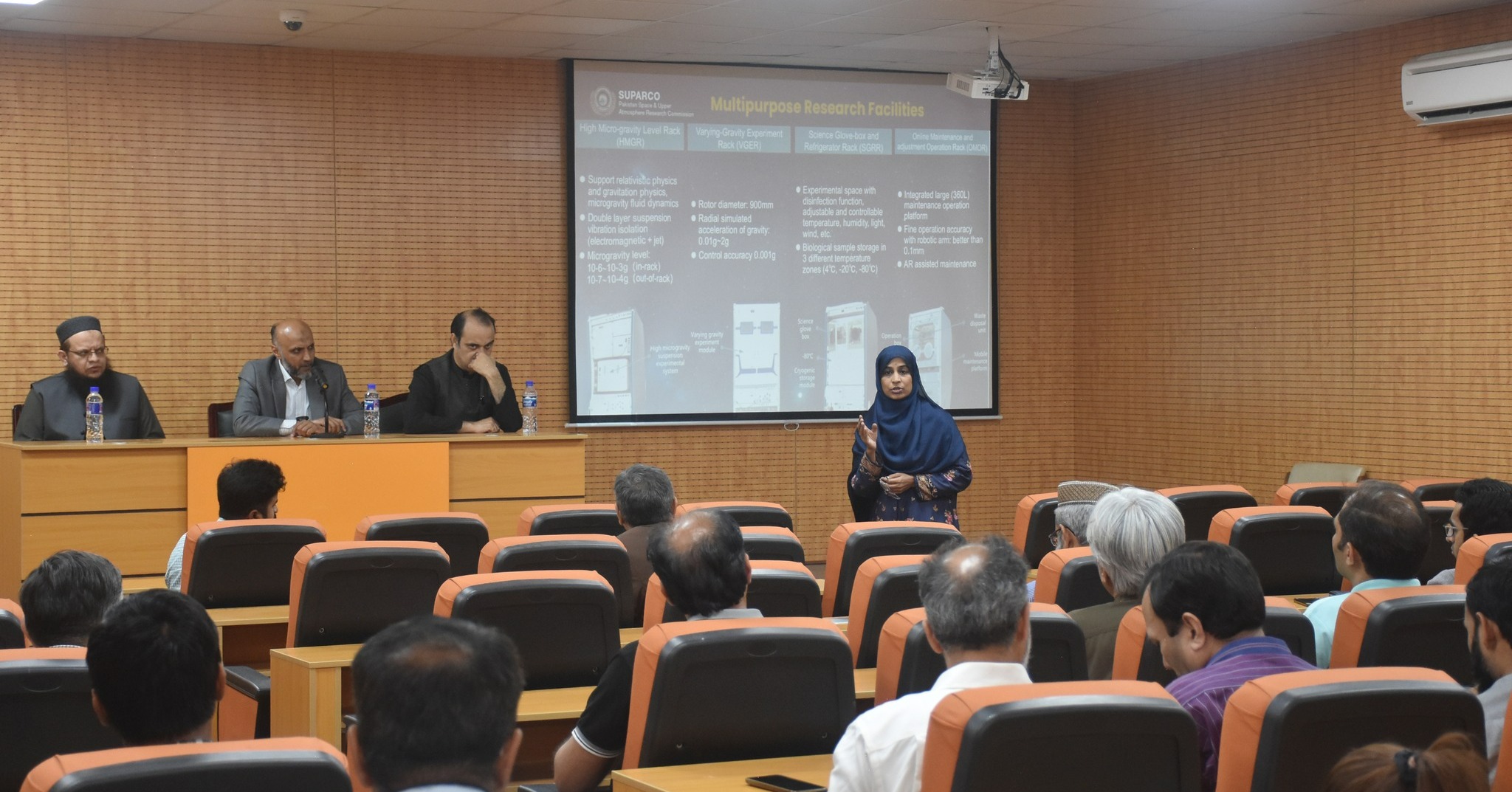 The Office of Research, Innovation, and Commercialization (ORIC), PIEAS, in collaboration with SUPARCO, successfully organized a seminar titled “Pakistan’s First Manned Space Mission to the Chinese Space Station (CSS)” on April 17, 2025, at the Lyceum, A-Block, PIEAS. The session was led by a team of three SUPARCO officials, headed by Brig. (R) Dr. Syed Amer Ahsan Gilani, who shared insights into Pakistan's groundbreaking journey towards its first human spaceflight mission in collaboration with China. The seminar aimed to inform and inspire the PIEAS research community about opportunities to propose and conduct space-based experiments aboard the CSS, encouraging academic contributions to this national milestone. The event saw active participation from faculty and research students, As part of their visit, the SUPARCO delegation held a cordial and constructive meeting with Rector PIEAS, discussing potential avenues of academic and research collaboration between PIEAS and SUPARCO.